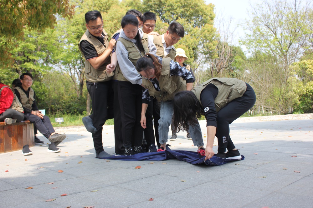 首先是翻叶子,这算是一个比较经典的游戏了,每组队员站在一块布上,然后在所有人不得以身体任意部位碰到布以外的地方,把布翻过来。看哪组时间最短。旨在提高大家的协作能力和团队精神。最终红队更胜一筹,稳中求快就会胜利。