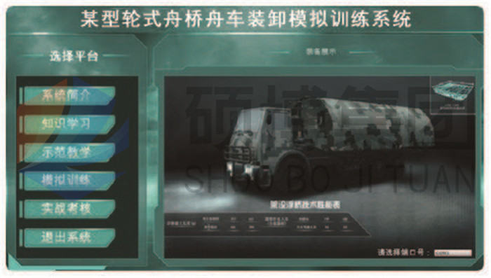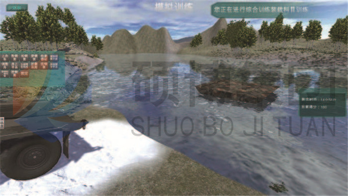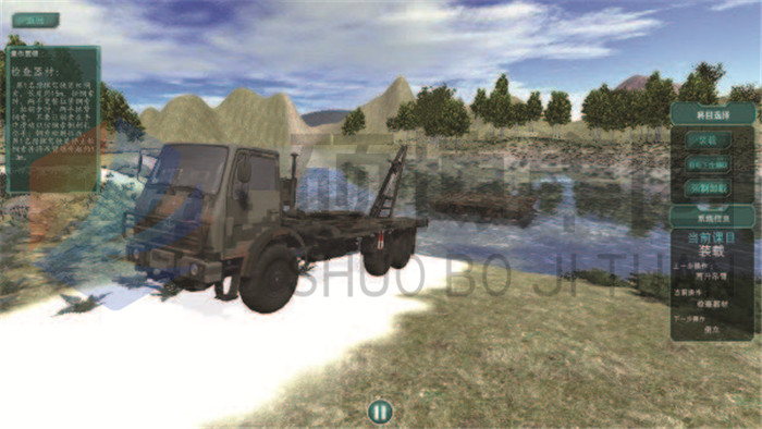 轮式舟桥舟车装卸模拟训练系统主要针对应用作业、协同作业、理论教学等内容进行学习和训练,使操作人员在练习操作步骤和方法的同时,掌握操作中的技术要点和安全注意事项,通过虚拟现实技术使受训人员能够较深刻的体会安全事故的后果,更好的避免安全事故的发生,同时可以使受训人员具备常规的检修和故障处理能力,提高装备培训的可靠性,有利于培养部队所需的多样化人才,达到部分代替实装的训练效果。